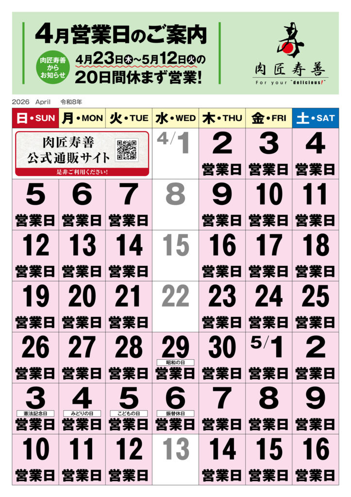 2026.03.31 営業カレンダーを掲載しました 4月営業日のご案内です。 4月23日(木)〜5月12日(火)まで20日間休まず営業致します。 営業カレンダーをご確認の上、ご来店ください。 「お買得品」につきましては掲載チラシをご覧下さい。